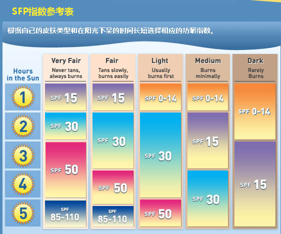 一个有趣的现象是研究发现阳光对人体的伤害程度跟皮肤的颜色有关。皮肤颜色越深越不容易受到阳光的伤害,因此黑人很少有被阳光灼伤的情况,而白人最容易被太阳灼伤。下表是著名防晒用品生产商 Banana Boat公司选择防晒产品SFP指数的指导原则。