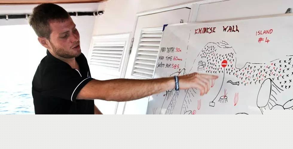 不是很熟悉潜点的情况下,请示其他潜导,而不是在尾追随。因为熟悉的潜导可以告诉你水流、亮点和危险点。