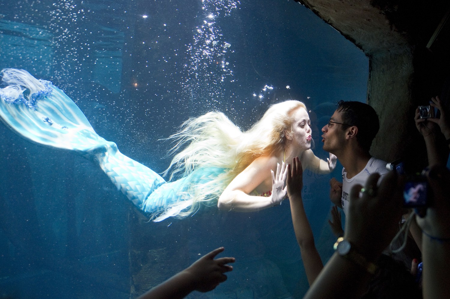 是不是美如天仙,仿佛一条真的美人鱼出现在了面前,吸引了好多小朋友。单身男性还有福利,可以和美人鱼MM隔空玩亲亲哦(羡慕死你们)。